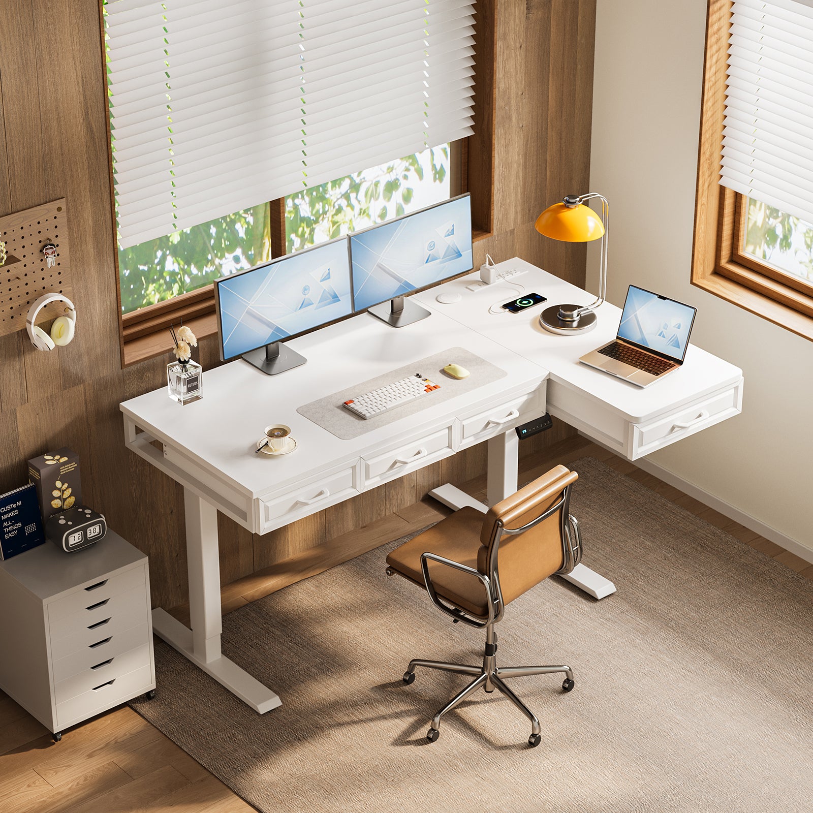L-Shaped Standing Desk with Wooden Drawers